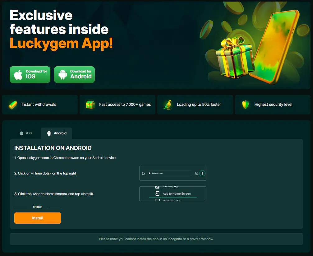 Volg deze eenvoudige stappen om de Lucky Gem mobiele casino snelkoppeling toe te voegen op je Android-apparaat. Dit is de enige officiële en veilige methode – er is geen Lucky Gem apk download vereist.