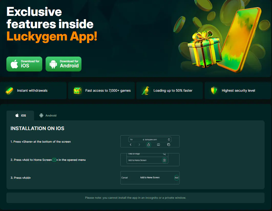 Ook iPhone- en iPad-gebruikers kunnen de Lucky Gem casino app als web-app installeren zonder download. Gebruik hiervoor de standaard Safari-browser.